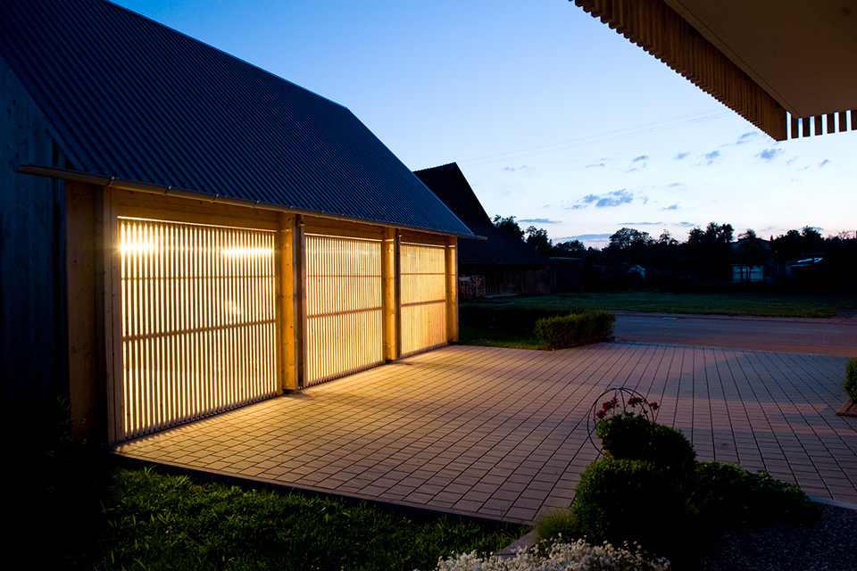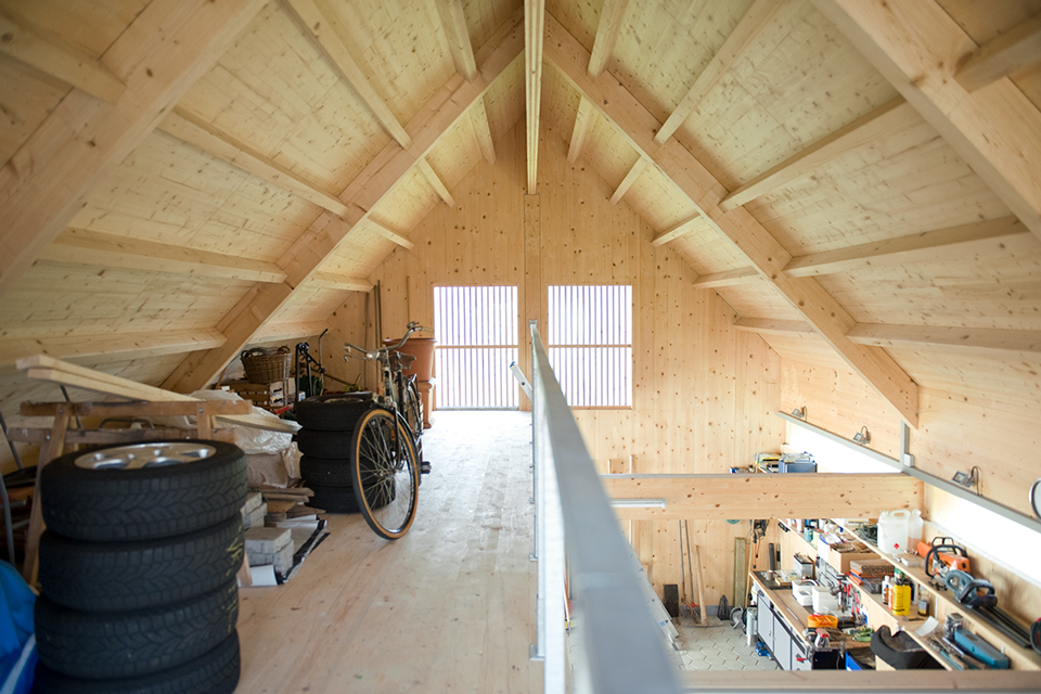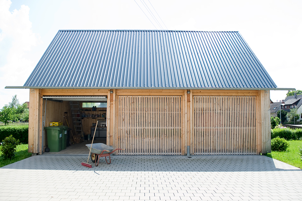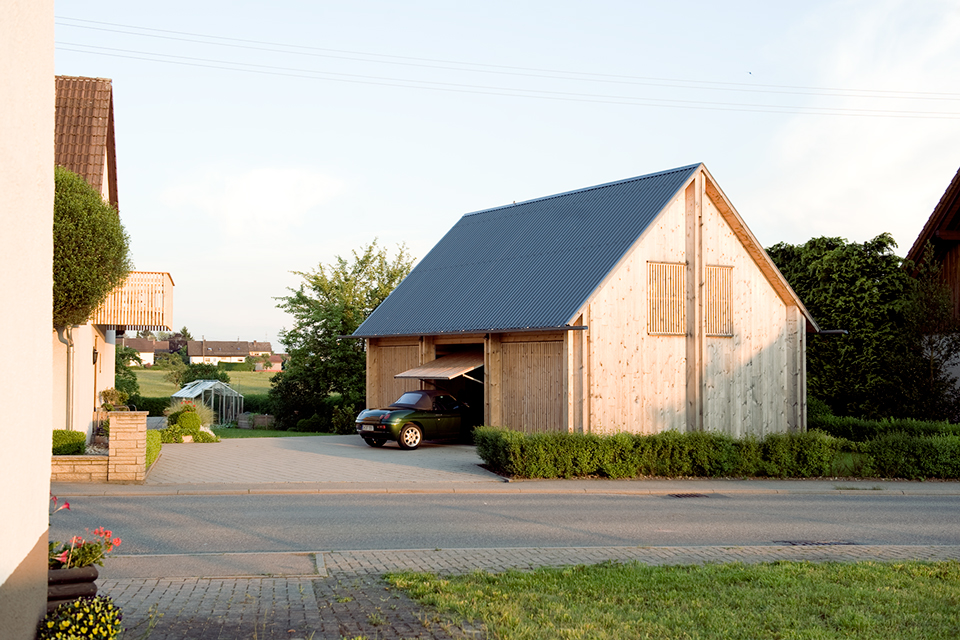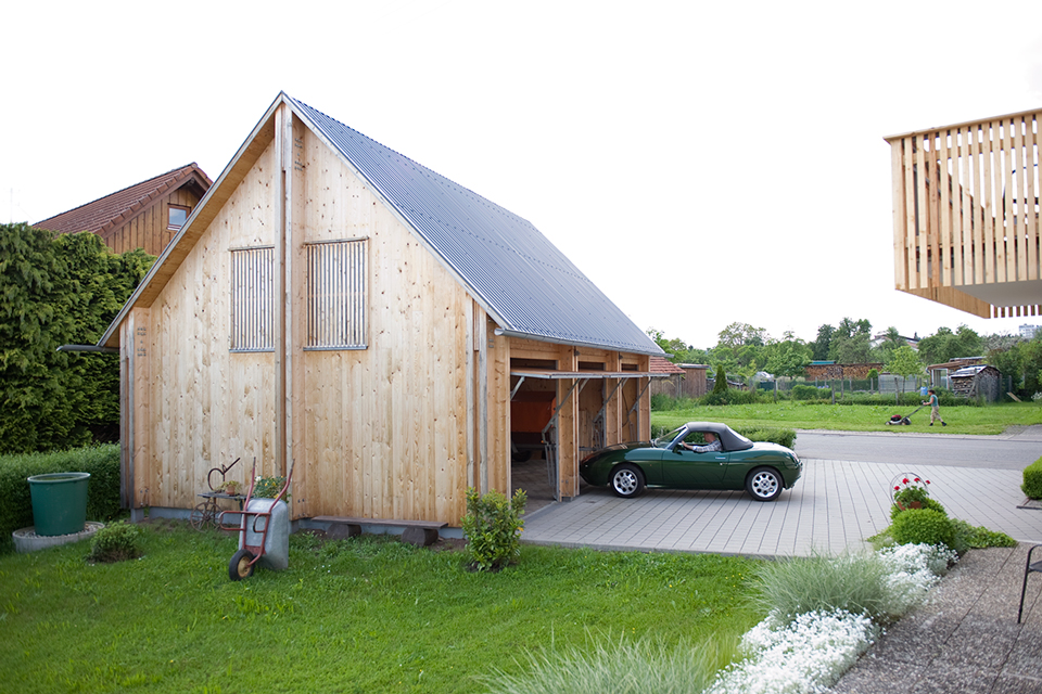 Die Garage meiner Eltern ist aus Holz. Massiv, ehrlich – ohne Schnickschnack. Die Wände aus Brettsperrholz, der Rest aus Vollholz, und alles aus Fichte. Aufgebaut wurde sie an einem Tag, von drei Zimmerern, meinem Vater, meinem Bruder und mir. Jetzt steht sie da und reiht sich ein in den losen Wechsel aus giebel- und traufständigen Häusern. Gemeinsam mit dem Wohnhaus aus den 1970ern bildet sie einen Hof und vermittelt zwischen Straßen- und Gartenraum. Alle sind glücklich. Die Eltern, weil sie nicht nur eine schöne Garage bekommen haben, sondern auch sehr viel Stauraum. Und ich, weil ich schon immer einmal mit Holz bauen wollte.