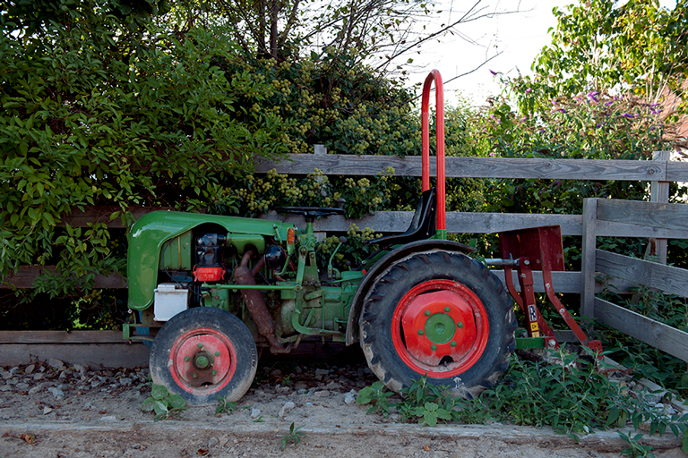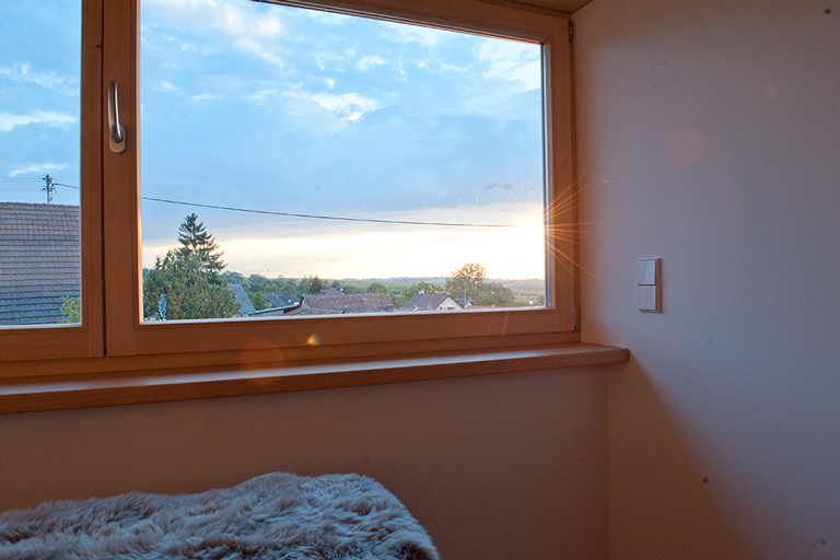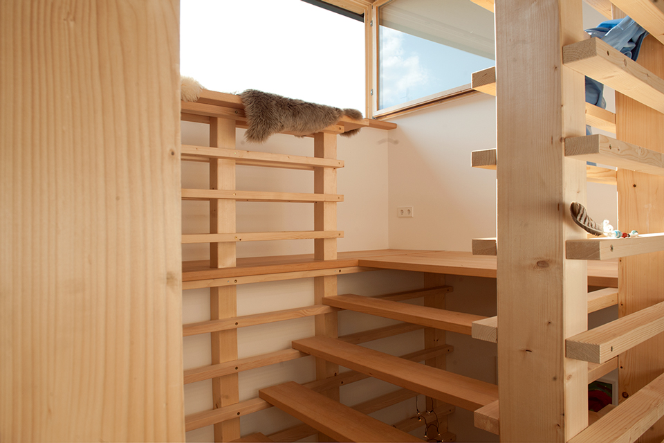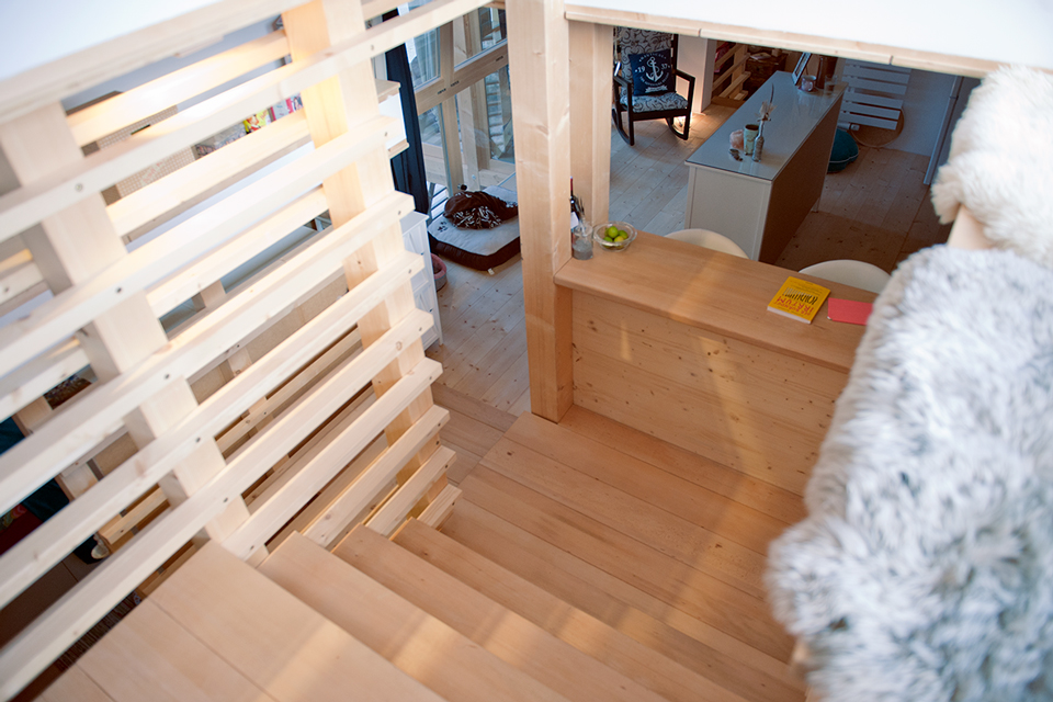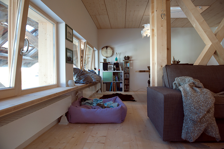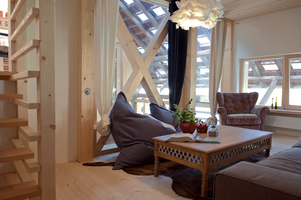 In der Tenne ist der Eingang. Von hier führt eine zweiläufige Treppe über die einzelnen Raumebenen bis in die Gaube mit Sitzbank und Südblick. Der Wohnraum erstreckt sich über die gesamte mittlere Ebene hinweg – unmittelbar über den ehemaligen Ställen, mit der Küche als Brücke über die Tenne. Belichtet wird der weitgehend nach Norden orientierte Scheunen- und Wohnraum über die in das vorhandene Dach eingefügten, eigens gefertigten Lichtziegel. Sie erzeugen ständig wechselnde Lichtstimmungen: innen wie außen und jeden Tag neu.