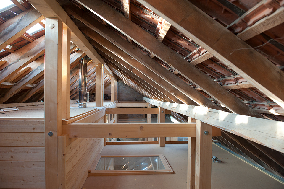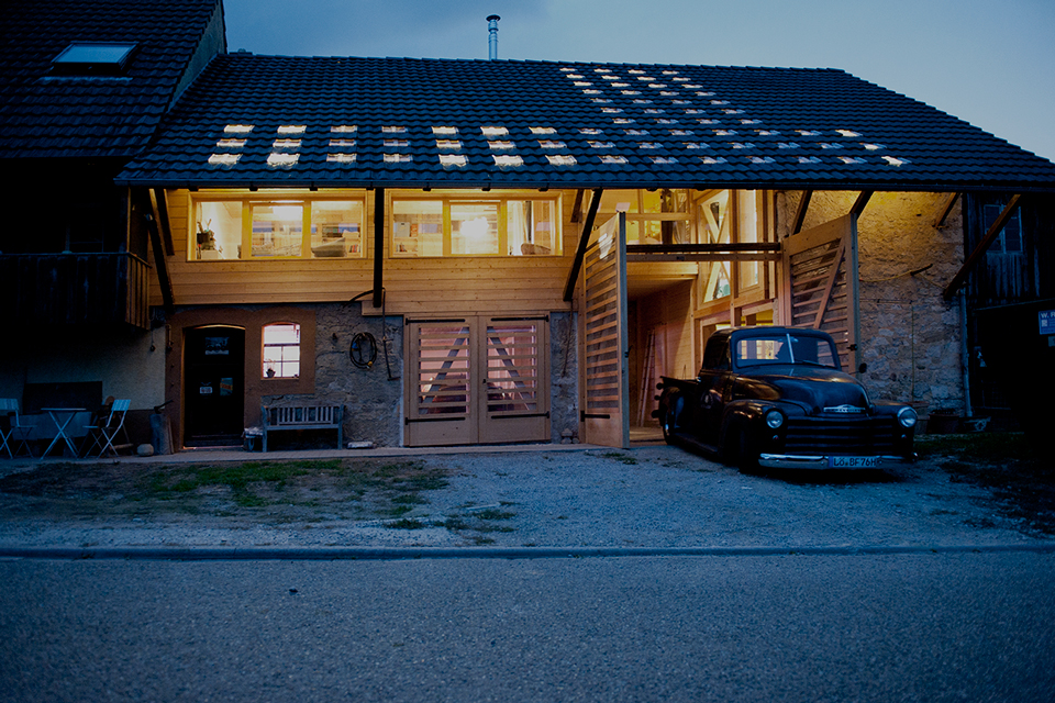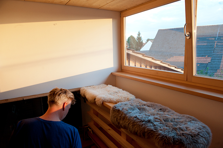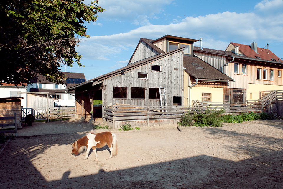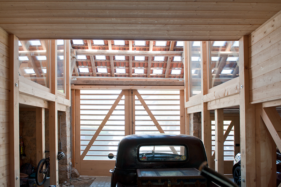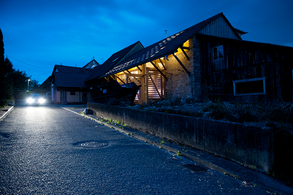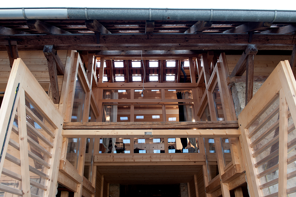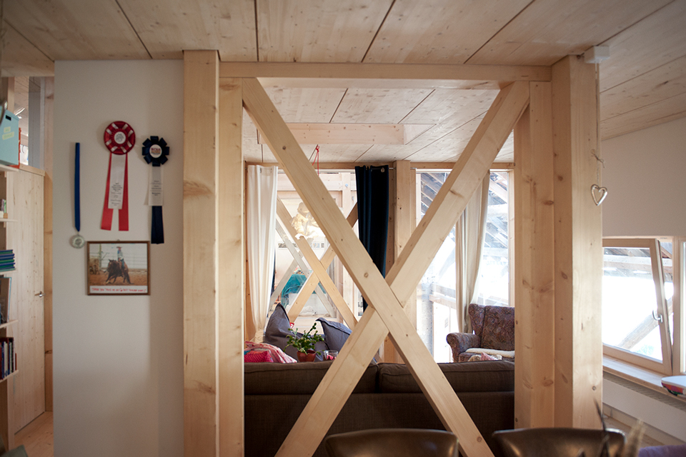 Vieles ist ursprünglich, kaum verändert, zeigt Spuren der Zeit. Genauso viel ist umgebaut, angepasst oder wurde über die Jahre schlicht hinzugebastelt. Der Bauernhof der Familie Ruch ist ein durchaus charmantes Konglomerat zum Leben. Der Umbau des Scheunenteils greift dieses Prinzip auf. „Wohnen in der Scheune“ – mit einem Einbau, ganz aus Holz. Die Holzkonstruktion ist raumbildende Struktur für die Wohnung und zugleich neues Tragwerk für das Dach.