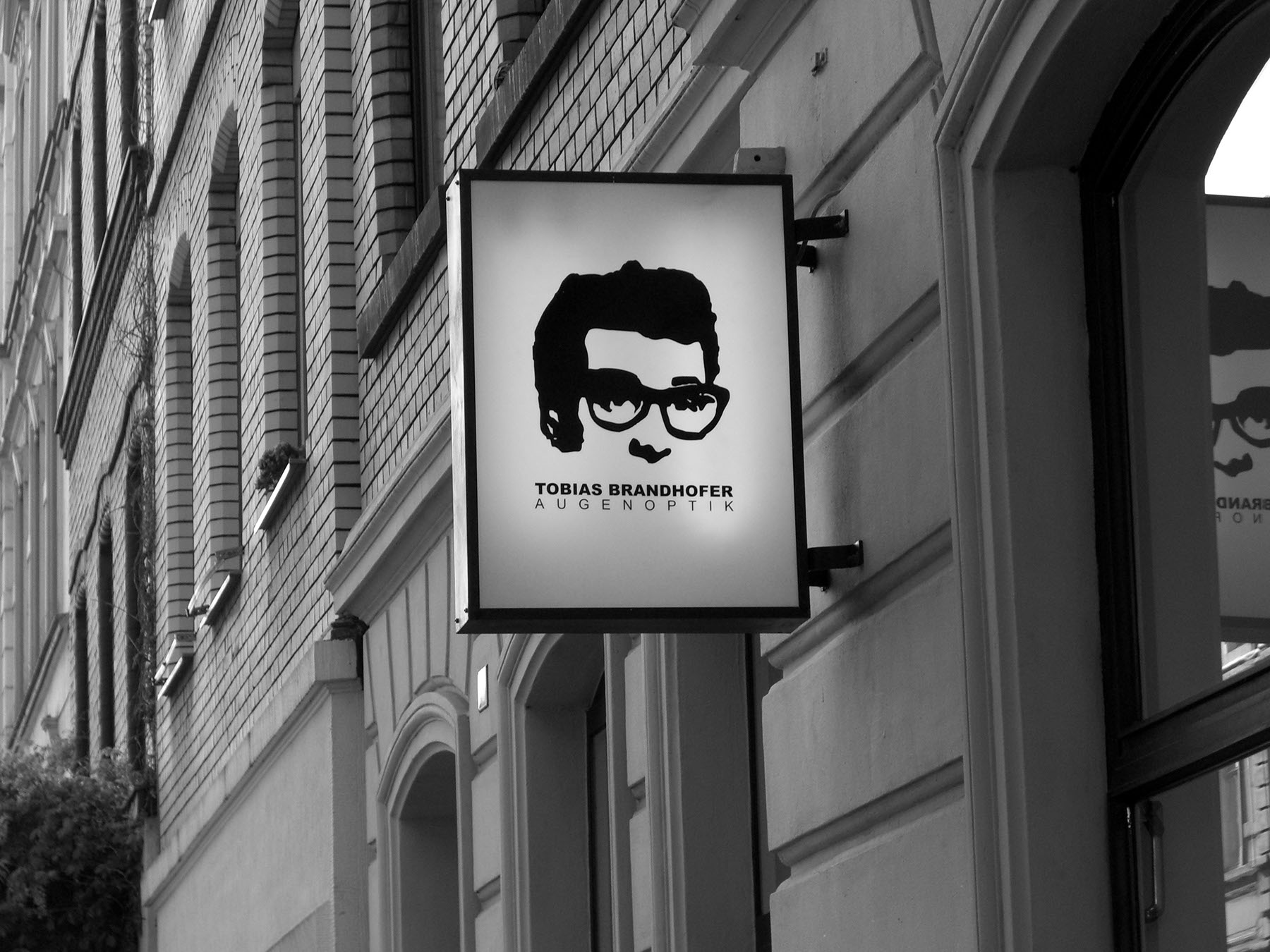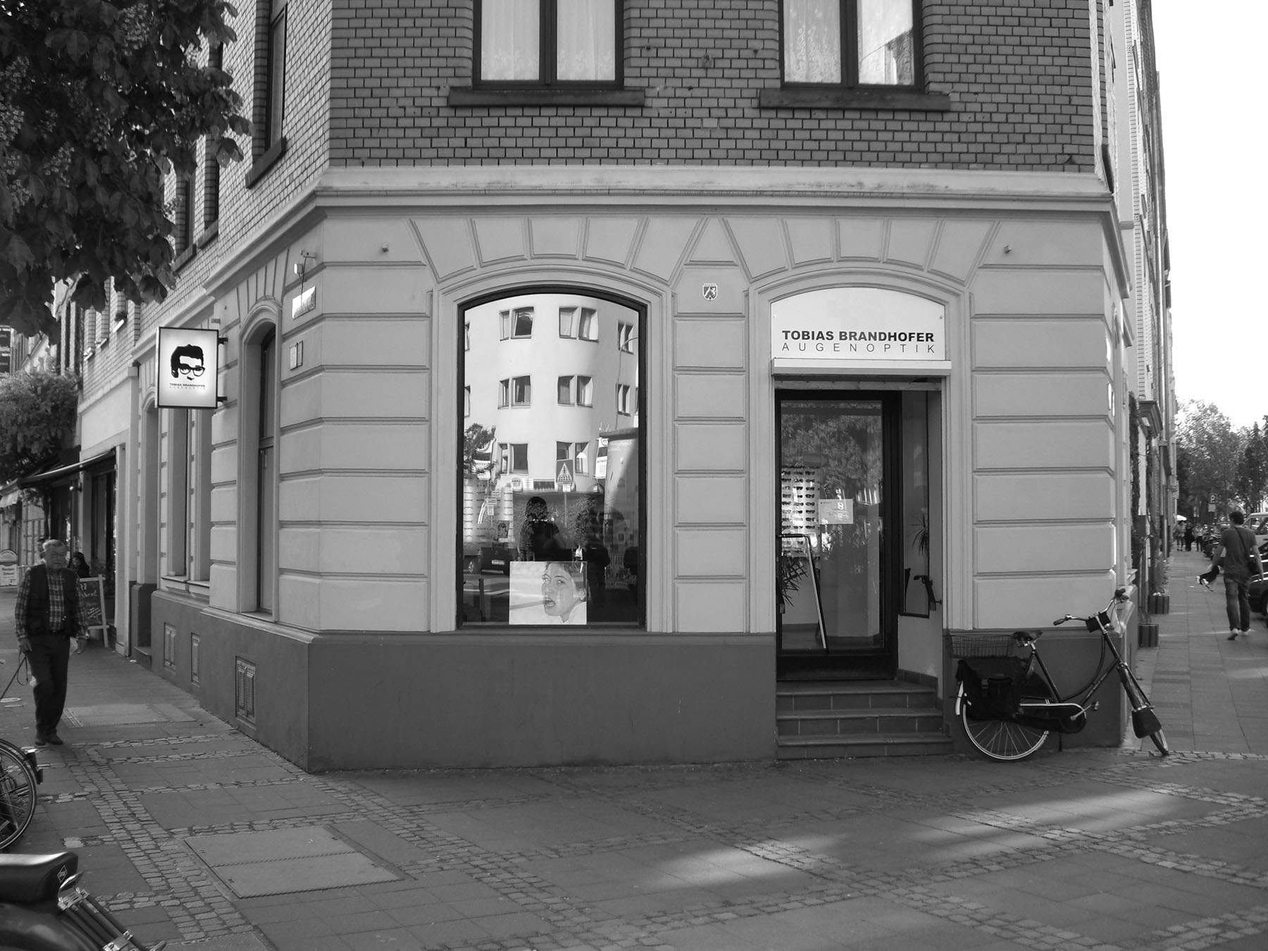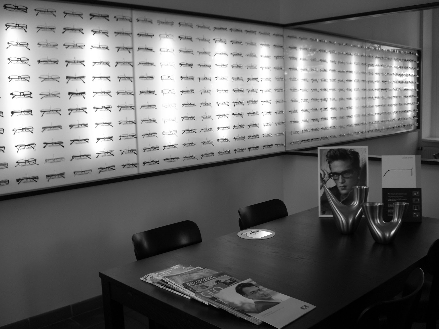 Das Ladengeschäft meines Bruders befindet sich in einem schönen Eckhaus in der Kölner Südstadt. Bestimmt wird der Laden durch die eigens entworfenen Leuchtkästen mit Spiegel für die Brillenpräsentation. Die Idee dazu ist einfach: Man nimmt eine Brille, setzt sie auf und kann sich anschauen. Die Kästen leuchten bis auf die Straße und geben dem Laden ein wiedererkennbares Gesicht. Wiedererkennbar sind auch die grafischen Elemente wie Logo und Schriftzug, die habe ich gleich mitgestaltet.