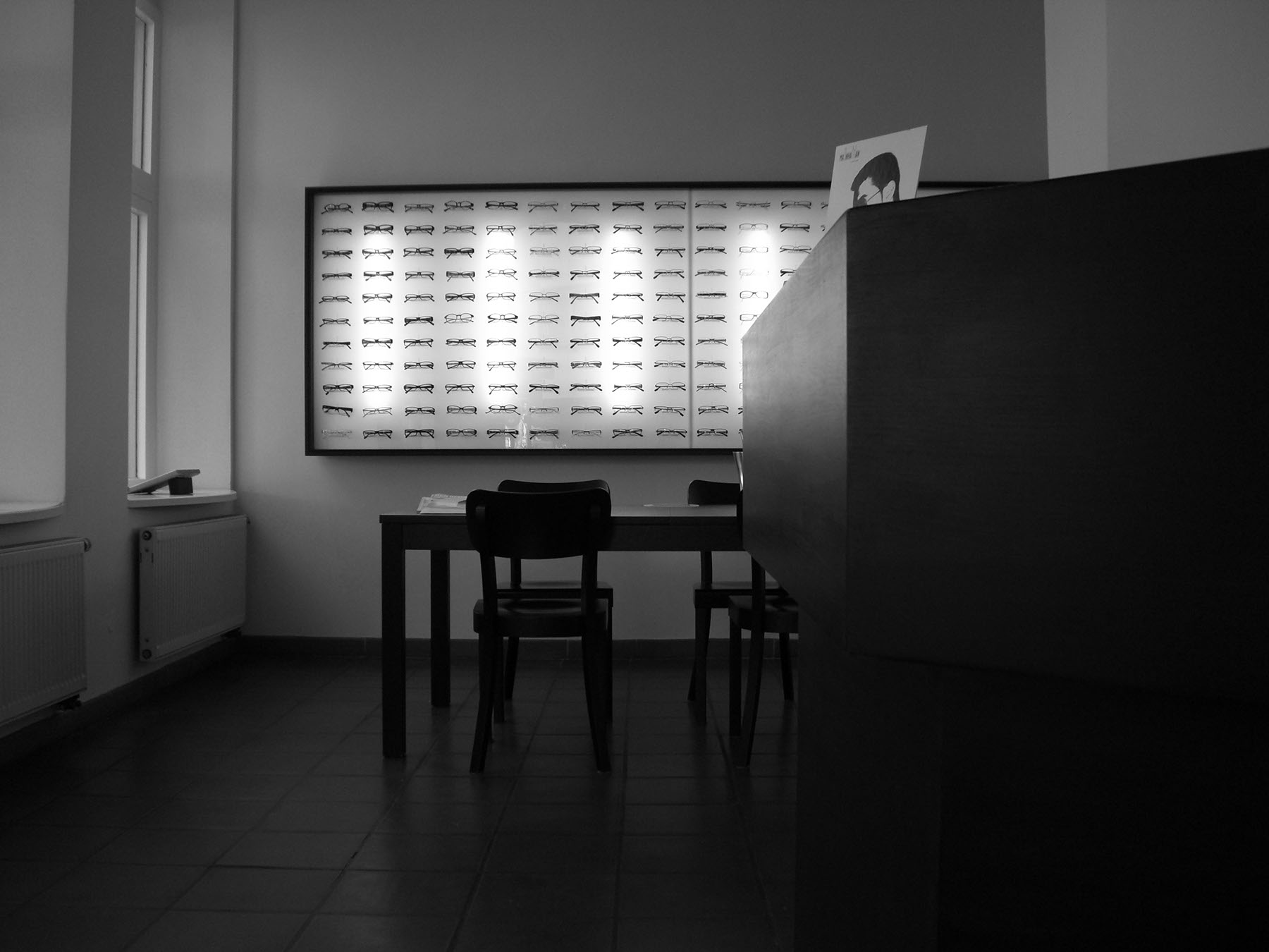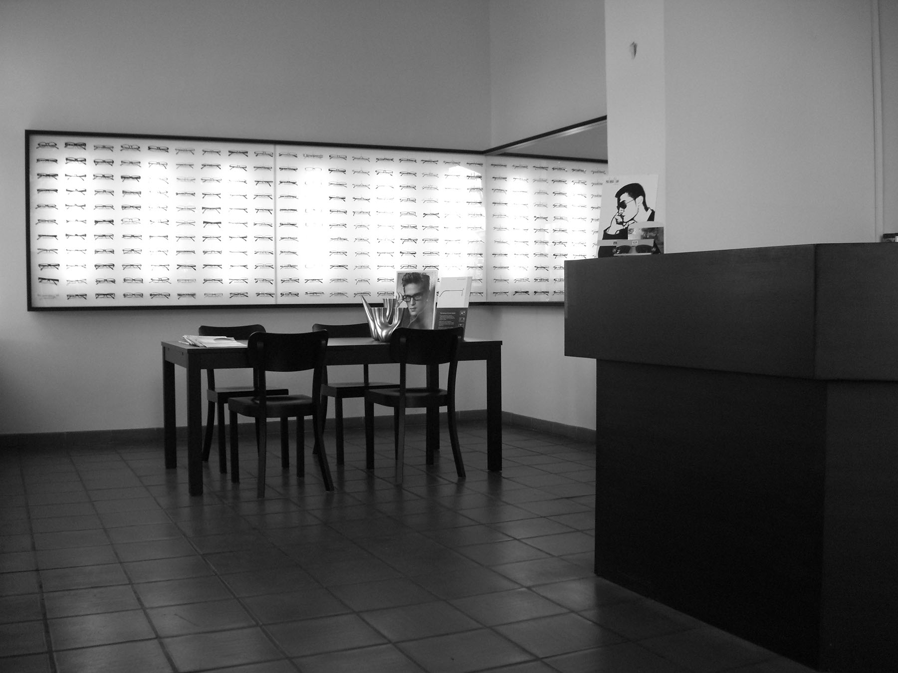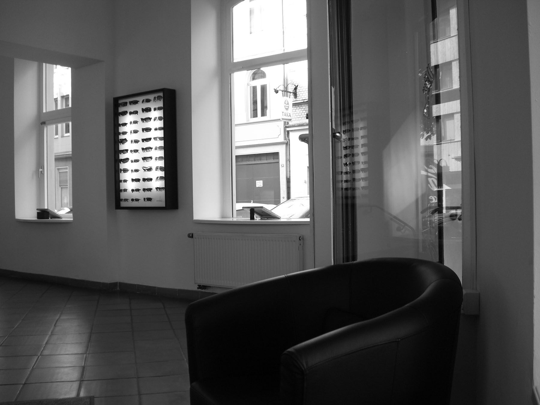 Das Ladengeschäft meines Bruders befindet sich in einem schönen Eckhaus in der Kölner Südstadt. Bestimmt wird der Laden durch die eigens entworfenen Leuchtkästen mit Spiegel für die Brillenpräsentation. Die Idee dazu ist einfach: Man nimmt eine Brille, setzt sie auf und kann sich anschauen. Die Kästen leuchten bis auf die Straße und geben dem Laden ein wiedererkennbares Gesicht. Wiedererkennbar sind auch die grafischen Elemente wie Logo und Schriftzug, die habe ich gleich mitgestaltet.
